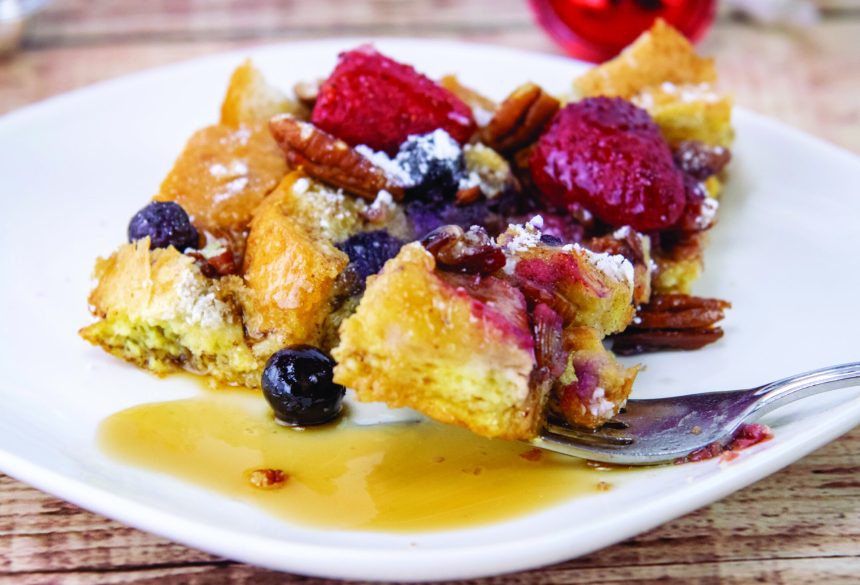 To make topping: Drizzle casserole with melted butter and sprinkle with brown sugar and pecans. Top with strawberries and blueberries.